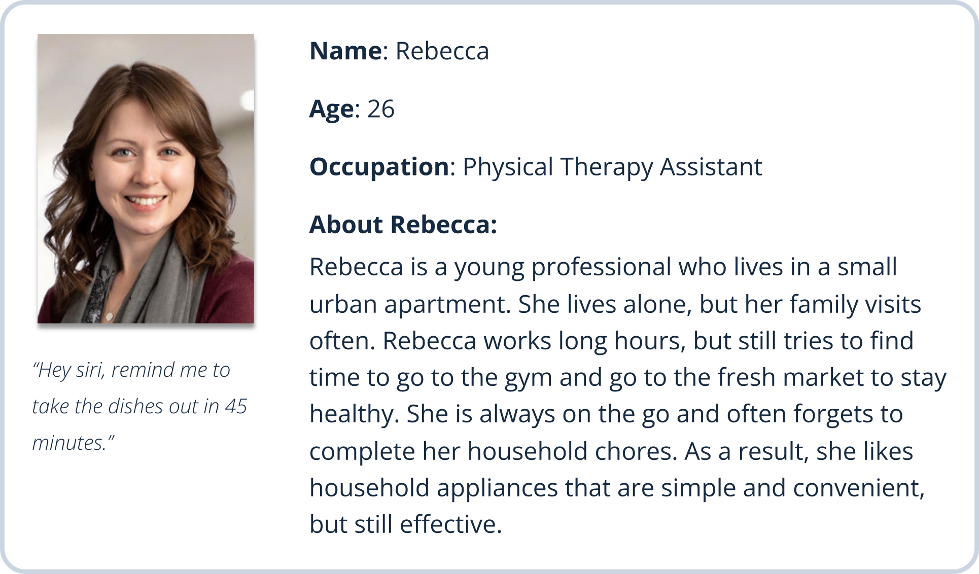 Rebecca is a 26-year-old professional who lives in a small urban apartment. She is someone who is always on the go, and therefore enjoys smart appliances.